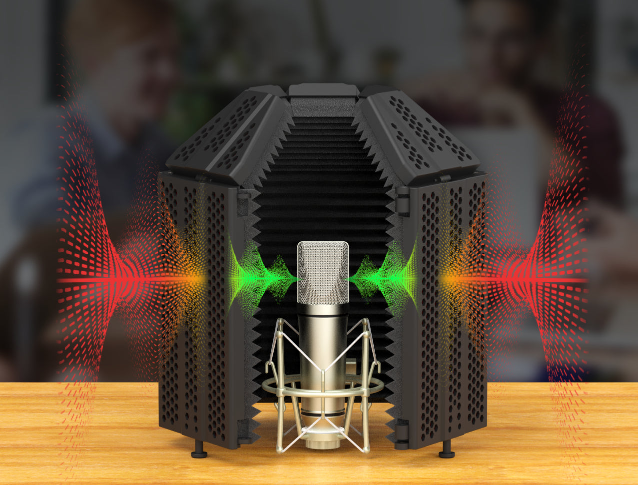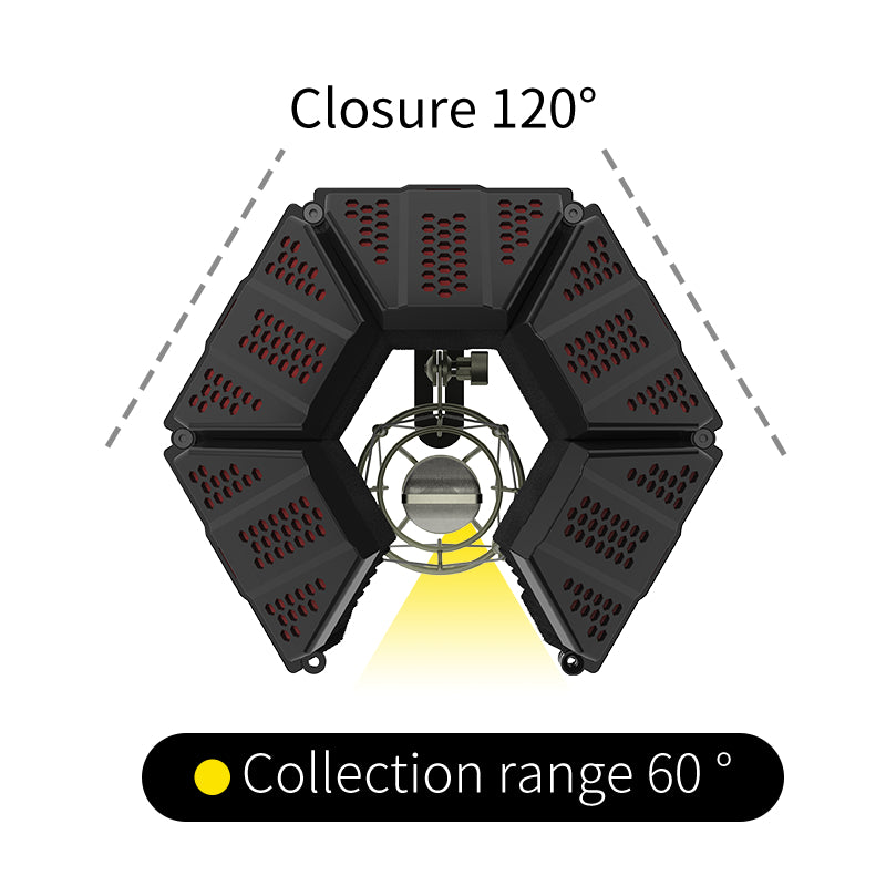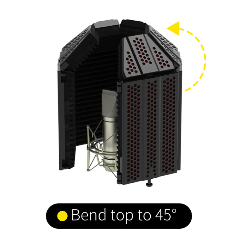 The mic shield consists of five panels that can be adjusted to be easy to assemble and you can adjust them to fit different recording requirements. You can adjust the sound collection angle from 60° to 180° to create the most optimum recording conditions The Bend top can be adjusted from 45 degrees to 90 degrees to make a steady design for more efficiency.